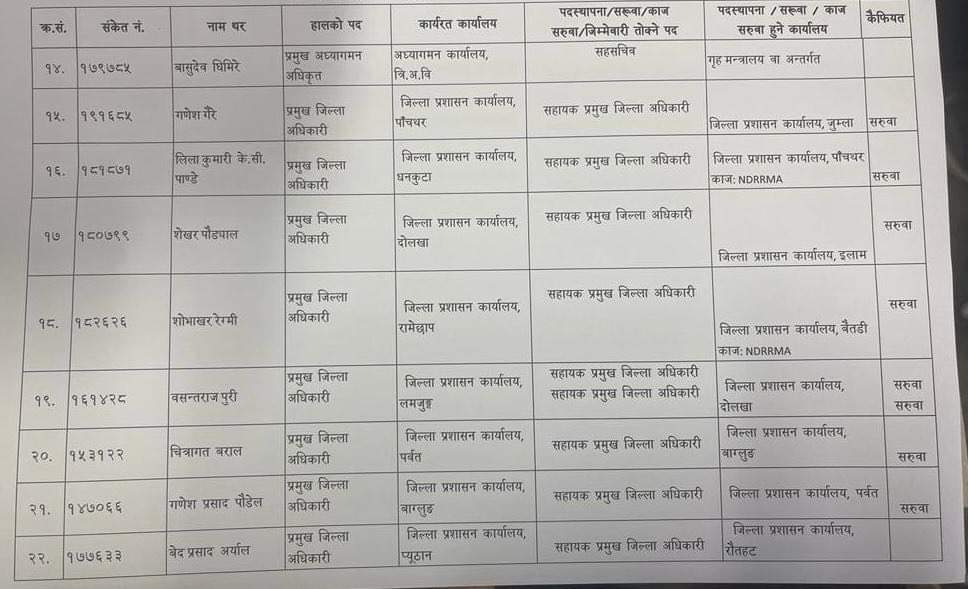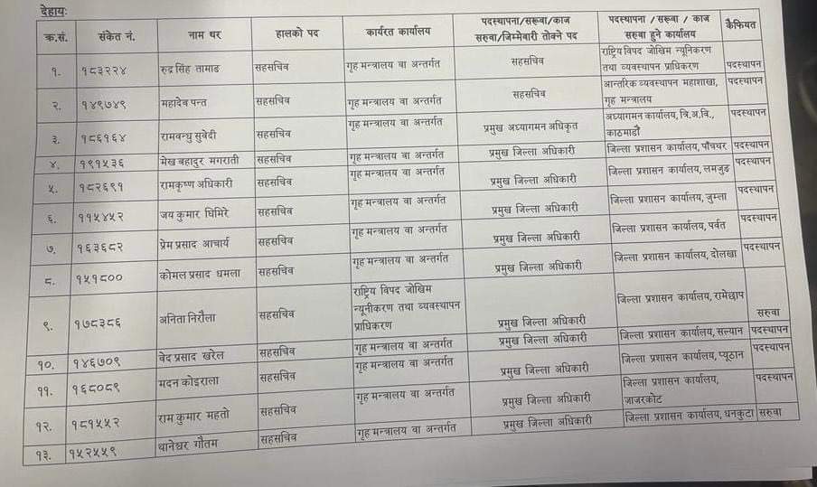 सूची अनुसार सहसचिव मेखबहादुर मगरातीलाई जिल्ला प्रशासन कार्यालय पाँचथर, रामकृष्ण अधिकारीलाई लमजुङ, जय कुमार घिमिरेलाई जुम्ला, प्रेमप्रसाद आचार्यलाई पर्वत, कोमलप्रसाद धमलालाई दोलखा, वेदप्रसाद खरेललाई सल्यान, मदन कोइरालालाई प्युठान र रामकुमार महतोलाई जाजरकोटको प्रमुख जिल्ला अधिकारीमा पठाइएको छ ।