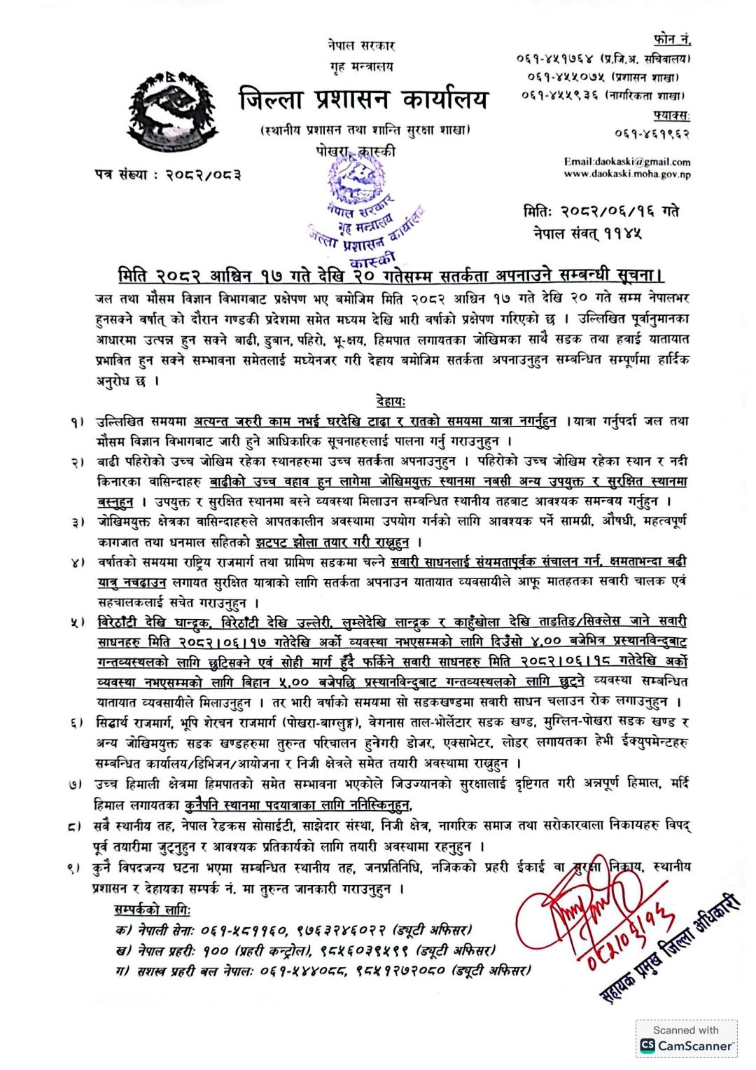 प्रमुख जिल्ला अधिकारी रुद्रादेवी शर्माले जारी गरेको विज्ञप्तिमा जल तथा मौसम विज्ञान विभागले असोज १७ देखि २० गतेसम्म गण्डकी प्रदेशमा मध्यमदेखि भारी वर्षा हुने पूर्वानुमान गरिएको उल्लेख गर्दै भारी वर्षाको समयमा गाडी नचलाउन आग्रह गरिएको छ। त्यस्तै सोही बिज्ञप्तिमा संवेदनशील मानिएका सडक खण्डमा भने सवारी सञ्चालनका लागि विशेष समय तालिका समेत लागू गरिएको छ।