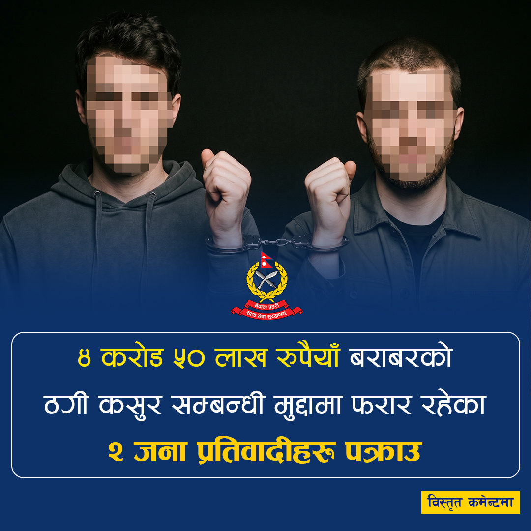 उनीहरु चारकरोड ५० लाख रुपैयाँ ठगी सम्बन्धी कसुर मुद्दामा मिति २०८२ चैत ५ गते कास्की जिल्ला अदालतबाट पक्राउ पुर्जी जारी भइ हालसम्म फरार रहेका थिए । खोजतलास गर्ने क्रममा उनीहरुलाई बुधबार दिउँसो १ बजे काठमाडौँको टोखा नगरपालिका वडा नं. ७ बाट पक्राउ गरिएको प्रहरीले जनाएको छ ।