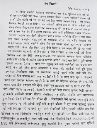 उपचारसँग सम्बन्धित कागजात र प्रमाण लुकाइएको तथा अप्रेसनअघि कुनै सहमति पत्रमा हस्ताक्षर नगराइएको मृतकका श्रीमान प्रकाशले बताए।
