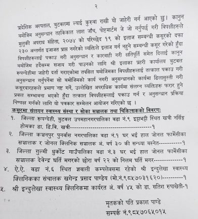 प्रकाशले घटनामा संलग्न रहेको भन्दै खत्री नर्सिङ होमका डा. डिबि खत्री, जोनल फार्मेसीरक्लिनिक सञ्चालक सन्ध्या बस्नेत, जोनल फार्मेसीका निलम घर्ती मगर, इन्दुलेखा स्वास्थ्य क्लिनिक सञ्चालक खगेन्द्र प्रसाद पाण्डे र इन्दुलेखा स्वास्थ्य क्लिनिकरहस्पिटलका डा. सतीश रुपाखेतीलाई तत्काल पक्राउ गरी कानुनी कारबाही गर्न माग गरेका छन्।