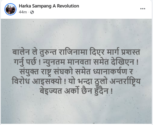बुधबार बिहान सामाजिक सञ्जालमार्फत उनले प्रधानमन्त्री बालेनमा न्यूनतम मानवता पनि नदेखिएको आरोप लगाउँदै मार्गप्रशस्त गरिनुपर्ने भन्दै राजिनामा मागेका हुन्।
