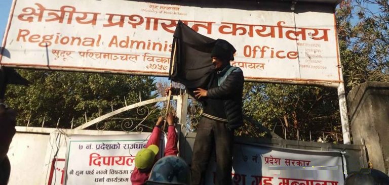 आन्दोलनकारीले ७ नम्बर प्रदेशको क्षेत्रिय प्रशासन कार्यालयमा कालो झण्डा गाडेका छन् । क्षेत्रिय प्रशासनसँगै क्षेत्रिय कार्यालयमा कालो झण्डा गाडेका छन् । दिपायल देखी सुरु भएको ¥याली क्षेत्रिय प्रशासन कार्यालयमा पुगेर कोणसभा गर्नुका साथै कालो झण्डा गाडेका थिए । आन्दोलनकारीले आज सिलगढी, दिपायल, राजपुर र बुडर बजारमा प्रर्दशन गरे । सरकारले मागको सुनुवाई नभएसम्म आन्दोलन जारी संर्घष समितिका संयोजक नरेन्द्र खड्काले बताए ।